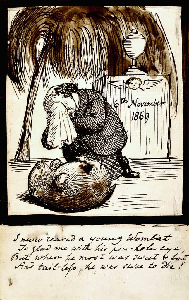Rossetti lamenting the death of his wombat, 1869. Dante Gabriel Rossetti loved exotic animals and began to collect them with a passion after the tragic death of his wife Elizabeth Siddal in 1862. He had moved to 16 Cheyne Walk in Chelsea, a house with a large garden that soon became a miniature zoo. The wombats had a special place in Rossetti’s heart. In a letter to his brother he described the arrival of the first one as ‘a Joy, a Triumph, a Delight, a Madness’. This drawing commemorates the short-lived second wombat. Instead of being laid to rest in the handsome tomb we see here, the unfortunate marsupial was actually stuffed and placed in Rossetti’s entrance hall.