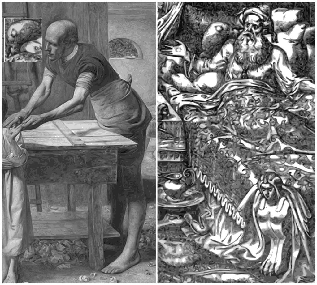 [left]: John Everett Millais: Carpenter in “Christ in the House of His Parents” (1850).